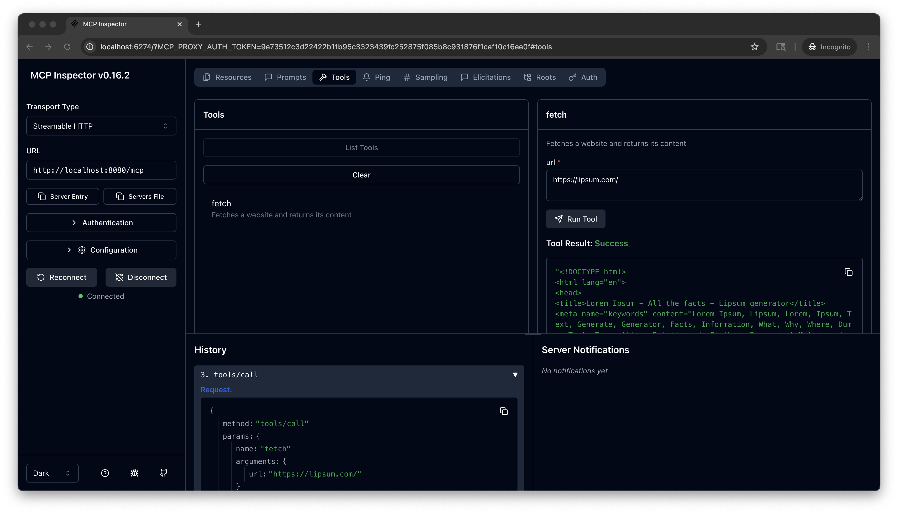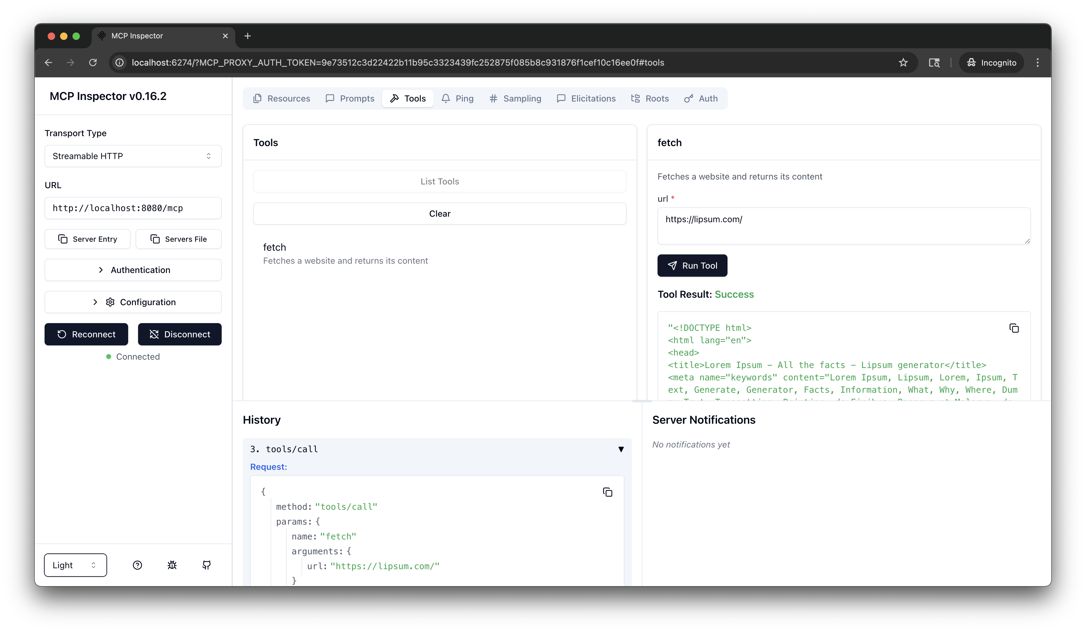 https://lipsum.com/, and click Run Tool.Verify that you get back the fetched URL content.